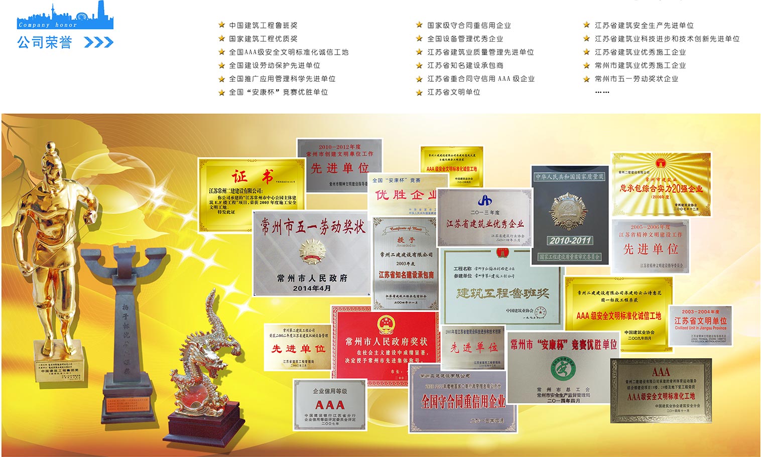 公司六十多年來為常州城市建設(shè)和經(jīng)濟(jì)發(fā)展作出了貢獻(xiàn)。在建筑業(yè)改革進(jìn)程中,公司施工能力和生產(chǎn)規(guī)模得到了進(jìn)一步發(fā)展,先后承建了常州體育館、常州工業(yè)展覽館、常州大酒店、常州亞細(xì)亞影城、中油國際大酒店等一大批有影響的高、大、難項(xiàng)目,并創(chuàng)三十余項(xiàng)省質(zhì)優(yōu)工程和揚(yáng)子杯獎(jiǎng),多項(xiàng)工程獲國家 級“安康杯”和AAA 級安全文明標(biāo)準(zhǔn)化誠信工地。公司施工的紅梅西村棋區(qū)住宅小區(qū)在早年被評為“魯班獎(jiǎng)”工程,常州城市應(yīng)急中心被評為2010—一2011年度常州地區(qū)的我國好的。
